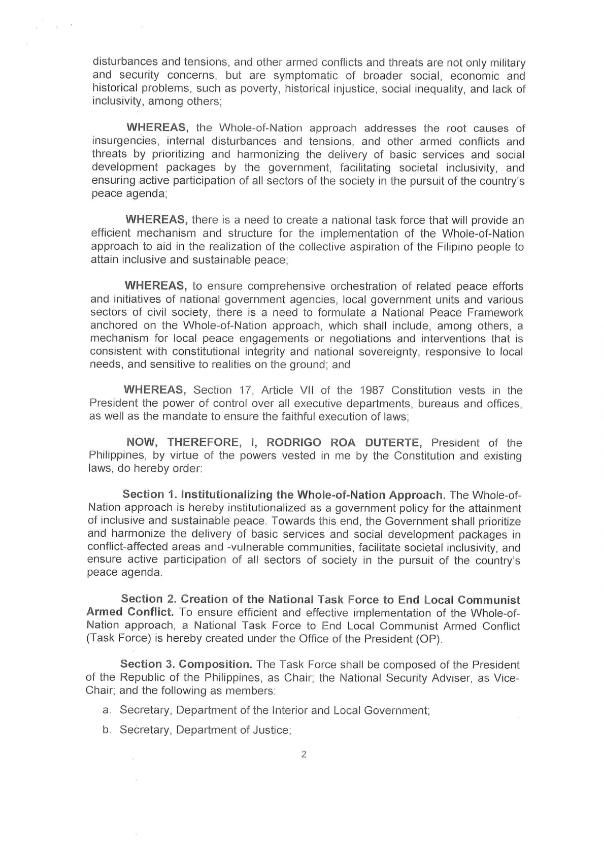 The National Task Force to End Local Communist Armed Conflict was created by virtue of Executive Order No. 70 signed by President Rodrigo Duterte on December 4, 2018 in response the breakdown of peace talks between the Government of the Republic of the Philippines (GRP) and the CPP/NPA/NDF.